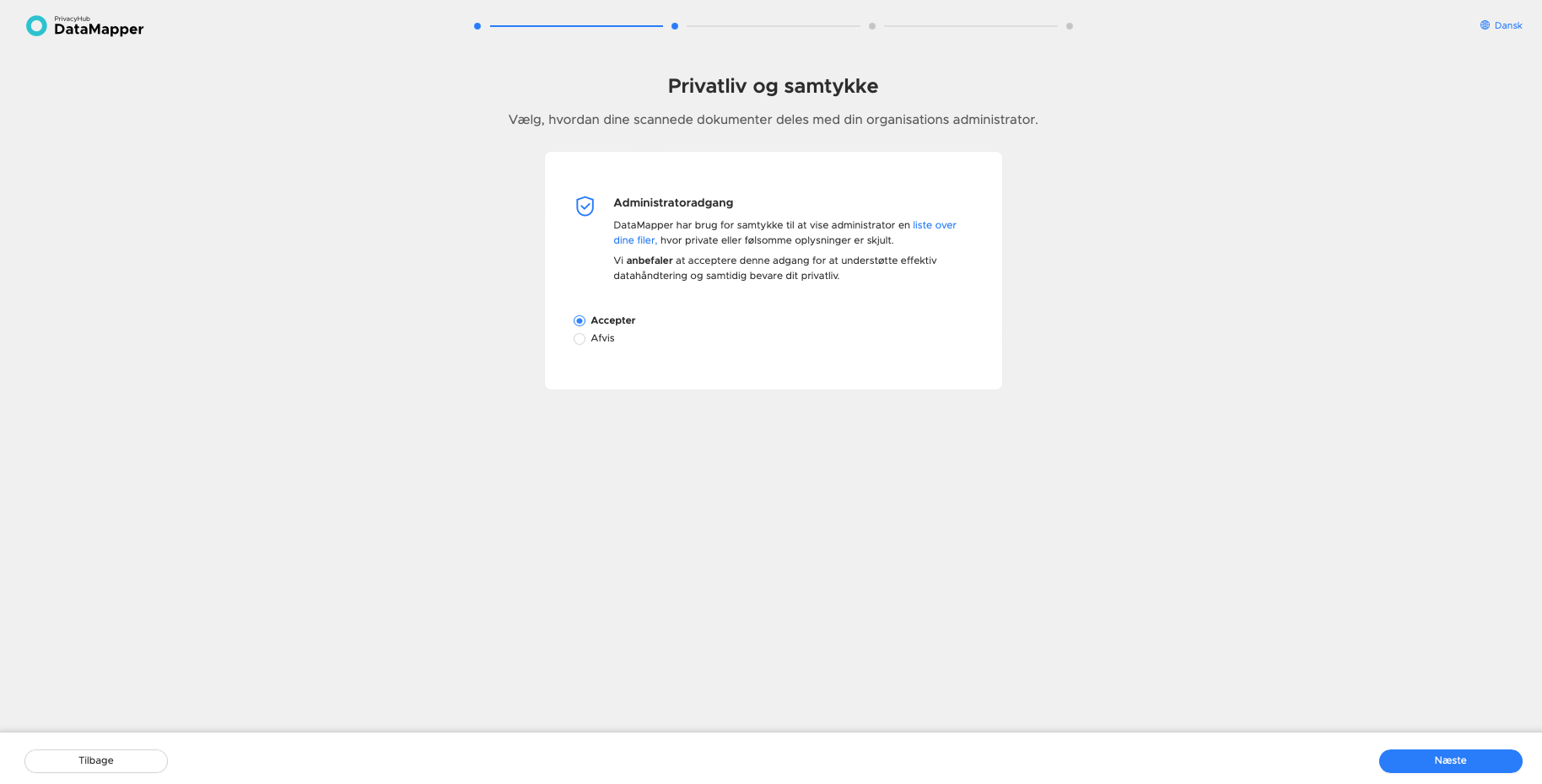 På dette trin i din onboarding skal du angive, hvorvidt din administrator skal have adgang til at se dine filer - eller du vil holde disse helt skjult. Ved at klikke "Accepter" giver du din administrator til at følge med i din løbende oprydning, men der bliver ikke vist sensitivt indhold. Klik på "liste over dine filer" for at se et eksempel på, hvordan det vil se ud - inden du klikker på Næste i højre hjørne.