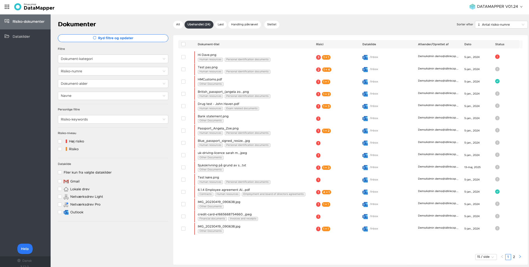 - Filter-mulighederne i venstre side kan hjælpe dig med at få gennemgået dine risk documents på en indsnævret måde - fx hvis du kun vil se filer indeholdende CPR numre, bestemt type, navn, dokumentalder etc.